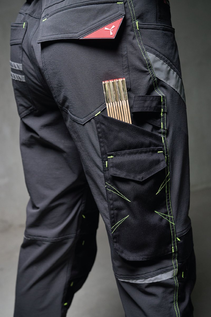 1 Tasche mit Patte und Klettverschluss und 1 Tasche ohne Patte, aber mit 2 reflektierenden Streifen, 1 Hammerschlaufe (rechtes Bein), 1 offene Zollstocktasche (rechtes Bein) und 1 Handytasche mit Patte und Klettverschluss (rechtes Bein), reflektierende Einsätze auf Kniehöhe (beide Beine), Stoßband in Kontrastfarbe (beide Beine).