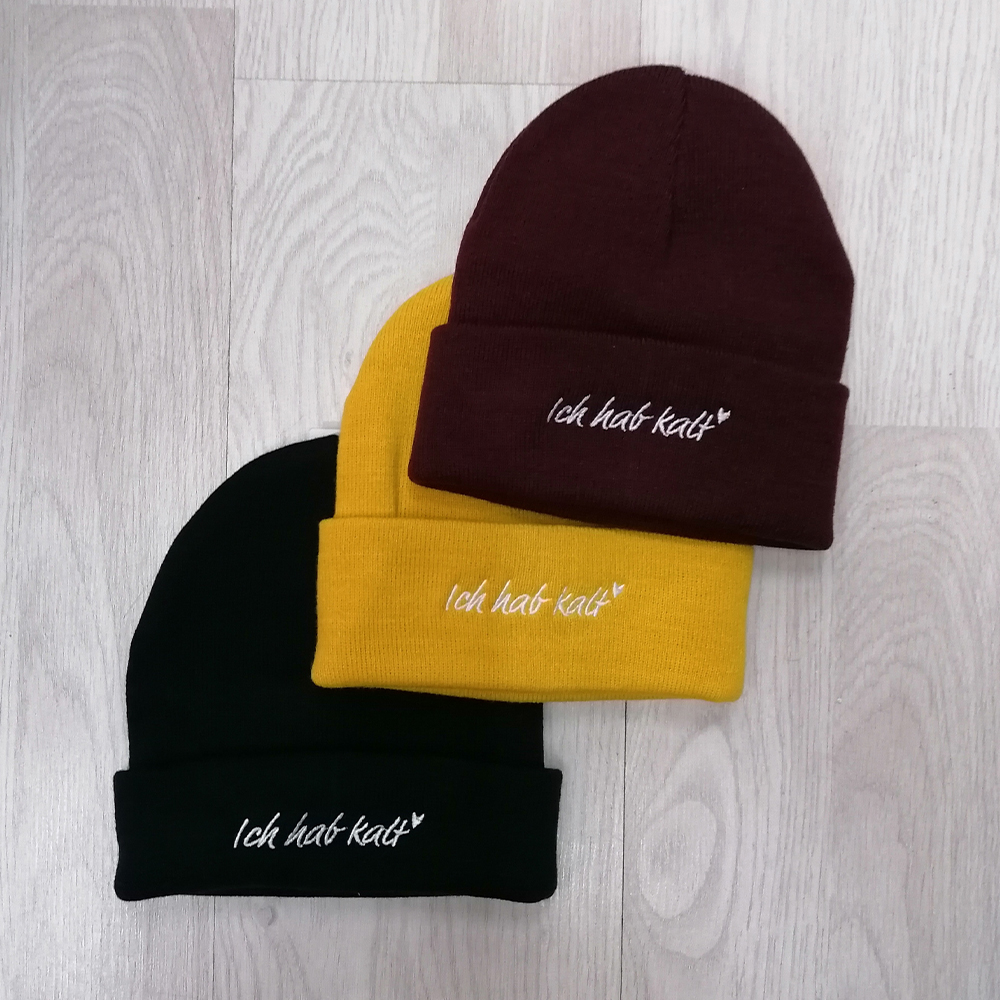 Damit der Kopf auch immer schön warm bleibt gibt es für alle endlich dieses bestickte Beanie Ich hab kalt in unterschiedlichen Farben zu kaufen.