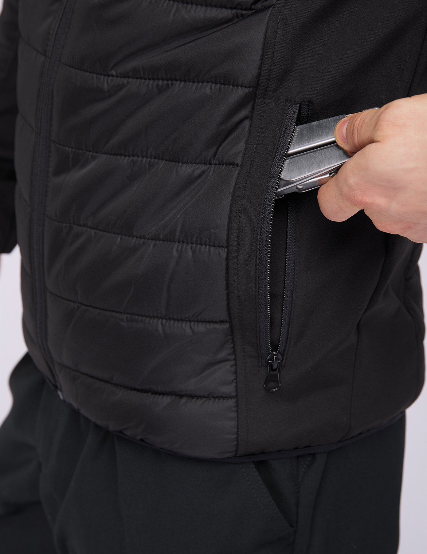 zwei seitliche schräg eingesetzte Eingrifftaschen mit Reißverschluss